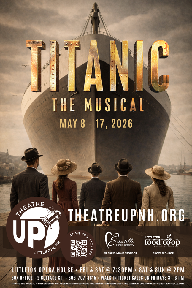 LITTLETON, NH — Closing out our 46th Season, Theatre UP invites audiences to experience the “Ship of Dreams” like never before, presented at the Littleton Opera House playing May 8 – 17. The company is proud to present the five-time Tony Award-winning Titanic: The Musical, featuring a majestic score by Maury Yeston and a poignant book by Peter Stone. This production trades cinematic melodrama for a soaring, soulful tribute to the real lives aboard the RMS Titanic. While many are familiar with the 1997 blockbuster film, this musical offers a different, more expansive journey. Rather than focusing on a central fictional romance, the stage production draws directly from the true stories of the passengers and crew. From the ambitious dreams of the third-class immigrants to the quiet dignity of the first-class legends, the show honors the actual people who stepped onto the deck in 1912.